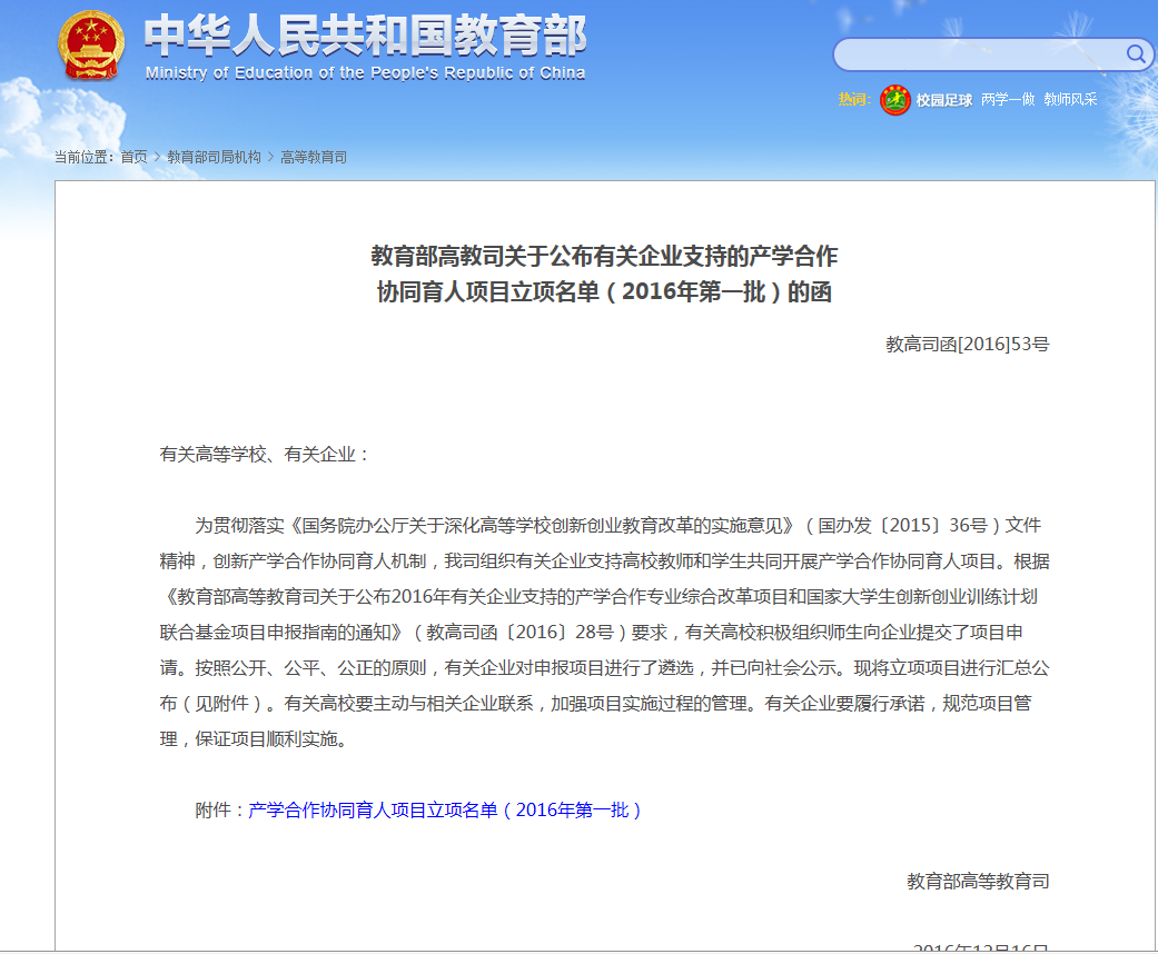 教育部网站 链接:http://www.moe.edu.cn/s78/A08/A08_gggs/A08_sjhj/201612/t20161219_292410.html日前,教育部高教司公布了2016年有关企业支持的产学合作协同育人项目立项名单(教高司函[2016]53号),我...