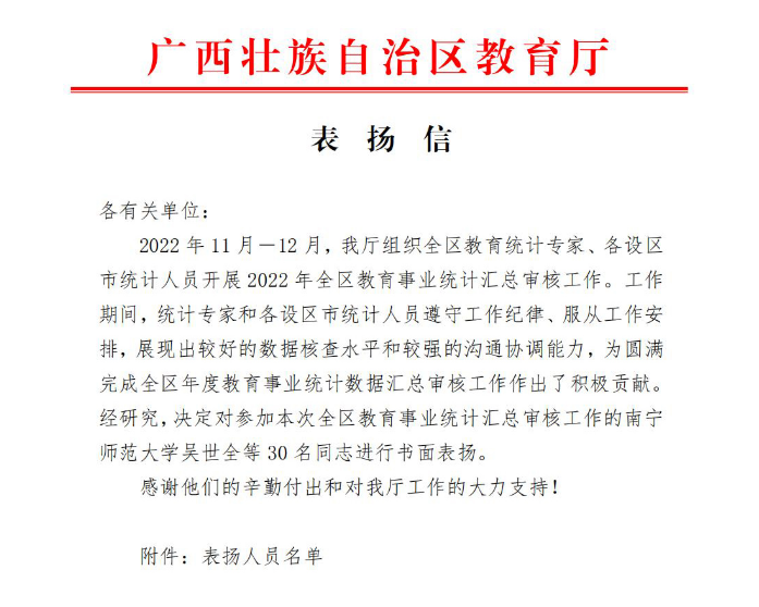 近日,自治区教育厅向best365官网发来表扬信,对在2022年全区教育事业统计数据汇总审核工作中表现优秀的30名同志进行通报表扬,best365官网教学质量监控与评估处张雪同志名列其中。教育事业统计工作是学校实施科学有效管理的一...