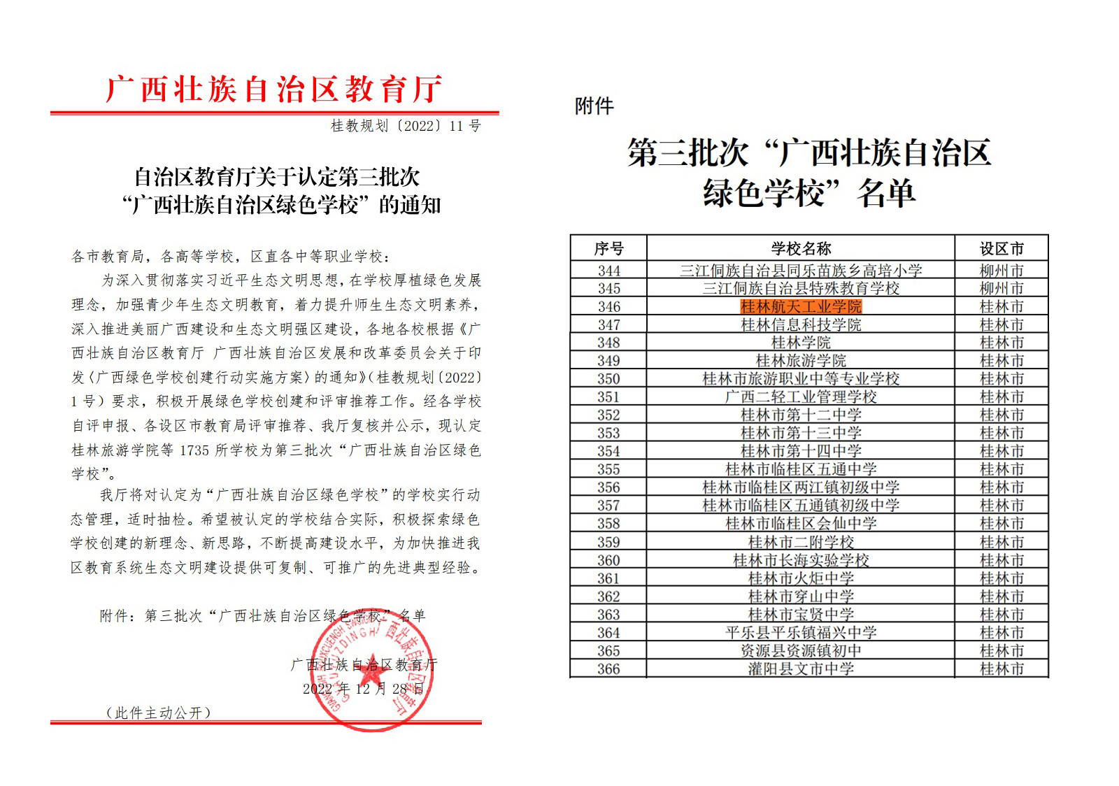 近日,自治区教育厅印发《关于认定第三批次“广西壮族自治区绿色学校”的通知》(桂教规划〔2022〕11号),学校顺利通过自治区绿色学校创建工作评审复核,获“广西壮族自治区绿色学校”称号。近年来,学校深入贯...
