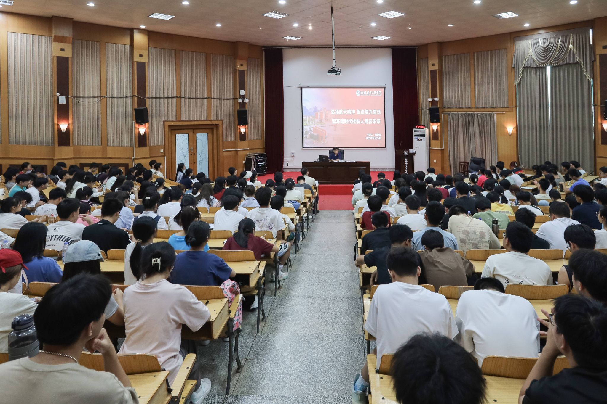 9月26日下午,学校党委书记韩峻峰以“弘扬航天精神、担当复兴重任,谱写新时代桂航人青春华章”为题,为全体2024级新生讲授“开学第一课”。380余名师生代表在北校区致远楼108现场聆听报告,全校七千余名新生(含...