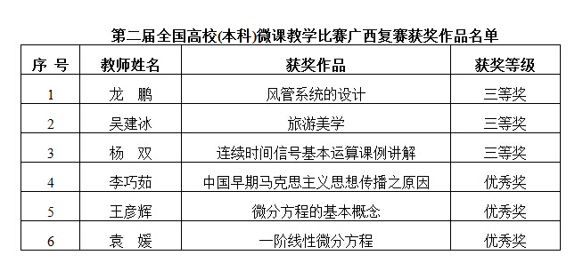 近日,第二届全国高校(本科)微课教学比赛广西复赛获奖名单揭晓,best365官网教师在本次比赛中喜获佳绩,获三等奖3项,优秀奖3项。