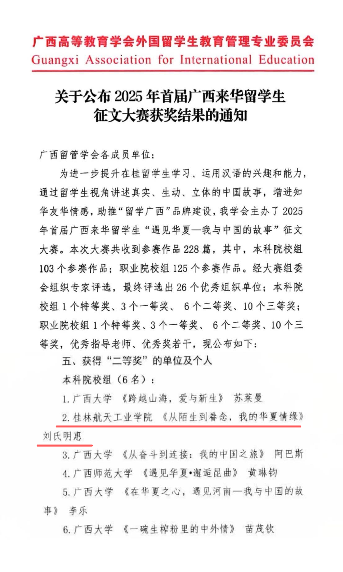 2025-11【喜报】best365官网留学生在首届广西来华留学生征文大赛中喜获佳绩
