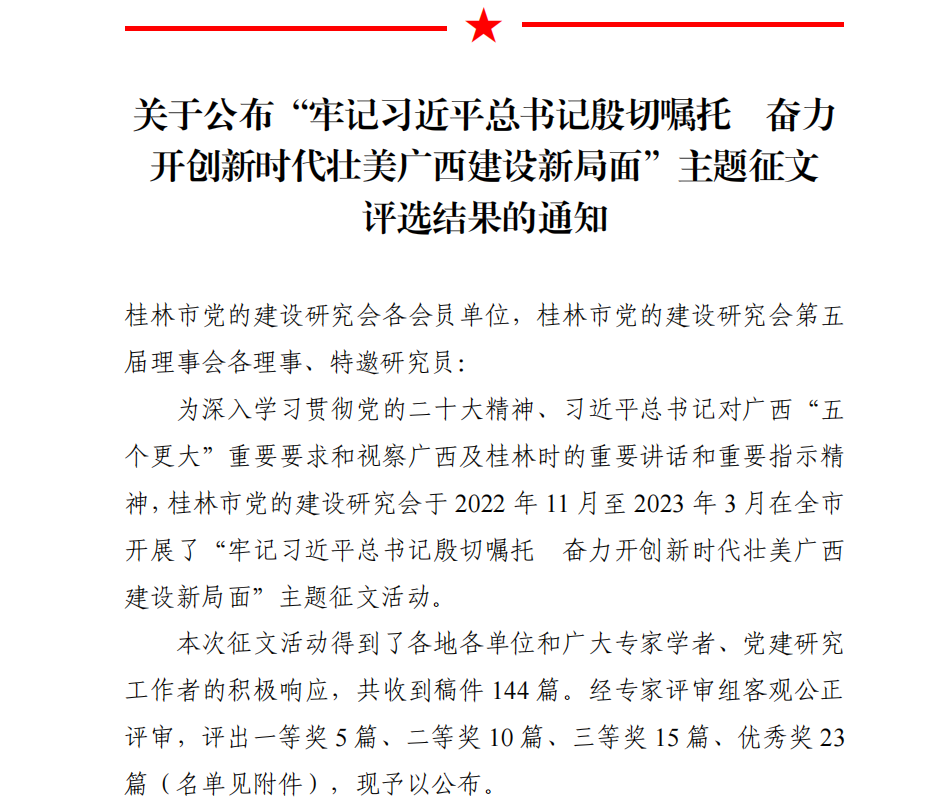 近日,桂林市党的建设研究会公布了“牢记习近平总书记殷切嘱托 奋力开创新时代壮美广西建设新局面”主题征文比赛获奖名单,best365官网共选送八篇文章,三篇获奖。其中徐艺萍老师文章《广西瑶族礼仪文化短视频的中华民族...