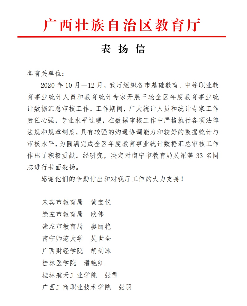 近日,广西教育厅发出表扬信,对在2020年全区教育事业统计数据汇总审核工作中表现优秀的33名同志进行通报表扬。best365官网教学质量监控与评估处张雪老师名列其中。一直以来,best365官网高度重视教育事业统计工作,坚持以习...