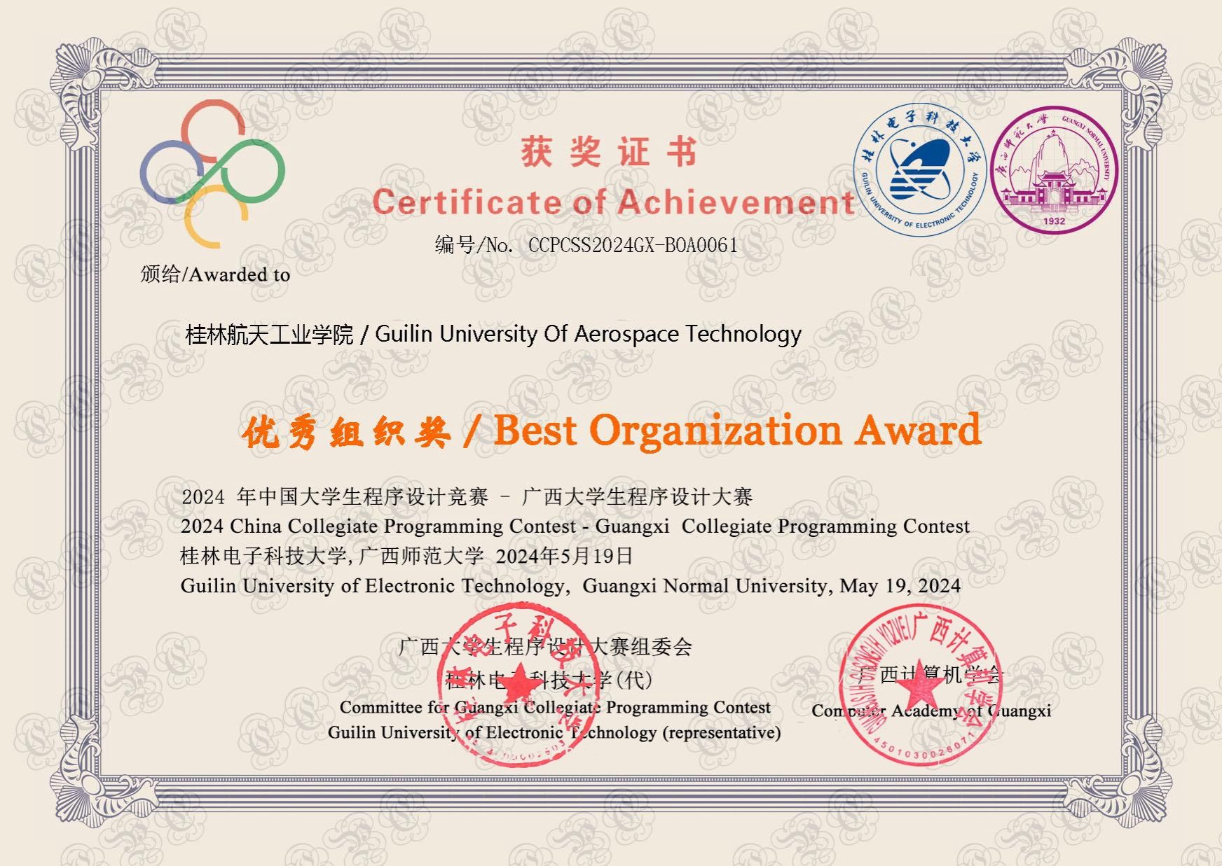 2024-10【喜报】best365官网荣获第七届广西大学生程序设计大赛“优秀组织奖”