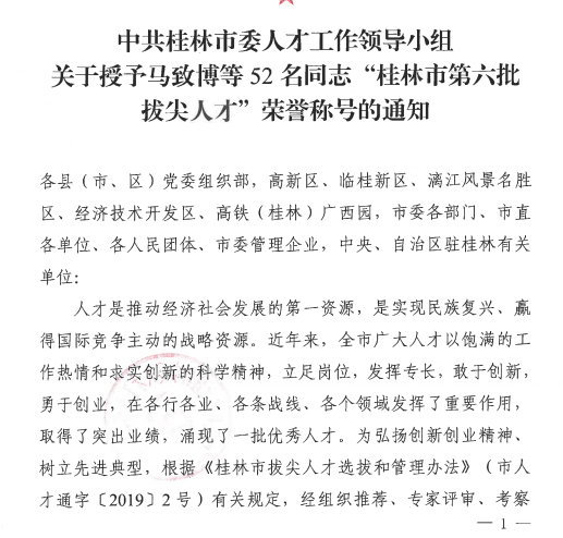 近日,中共桂林市委人才工作领导小组发布《关于授予马致博等52名同志“桂林市第六批拔尖人才”荣誉称号的通知》(市人才通字﹝2023﹞3号),best365官网韩兴国同志被授予“桂林市第六批拔尖人才”荣誉称号。“桂林市拔尖...