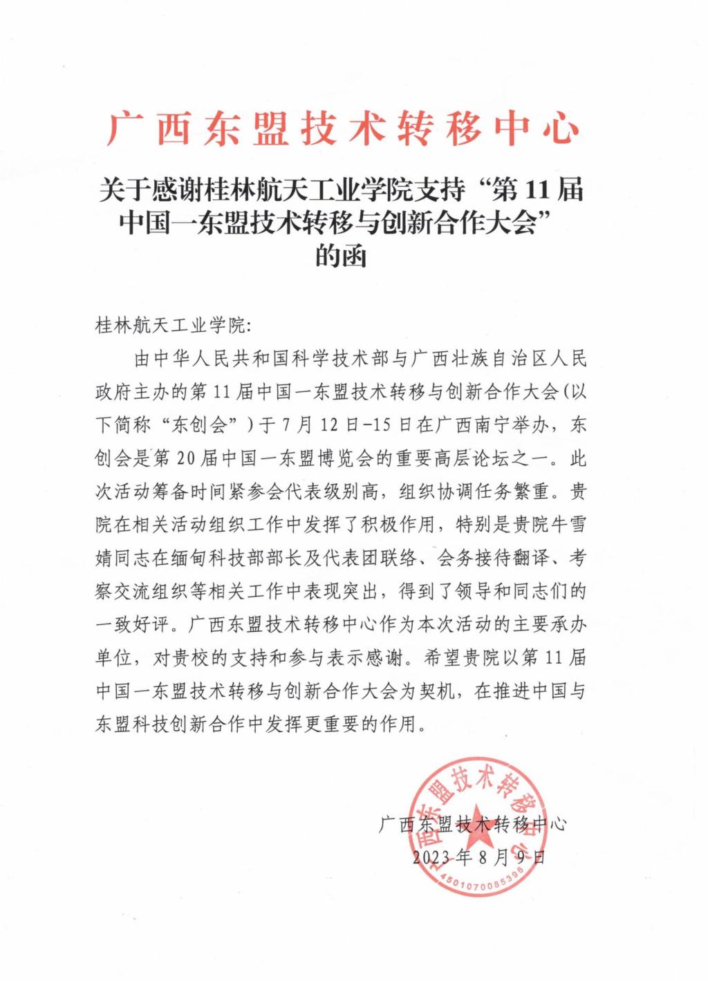 2023-09广西东盟技术转移中心给学校发来感谢函