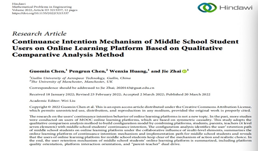 近期,管理学院教师陈国民博士的论文《Continuance Intention Mechanism of Middle School Student Users on Online Learning Platform Based on Qualitative Comparative Analysis Method》被评选为ESI(Essenti...