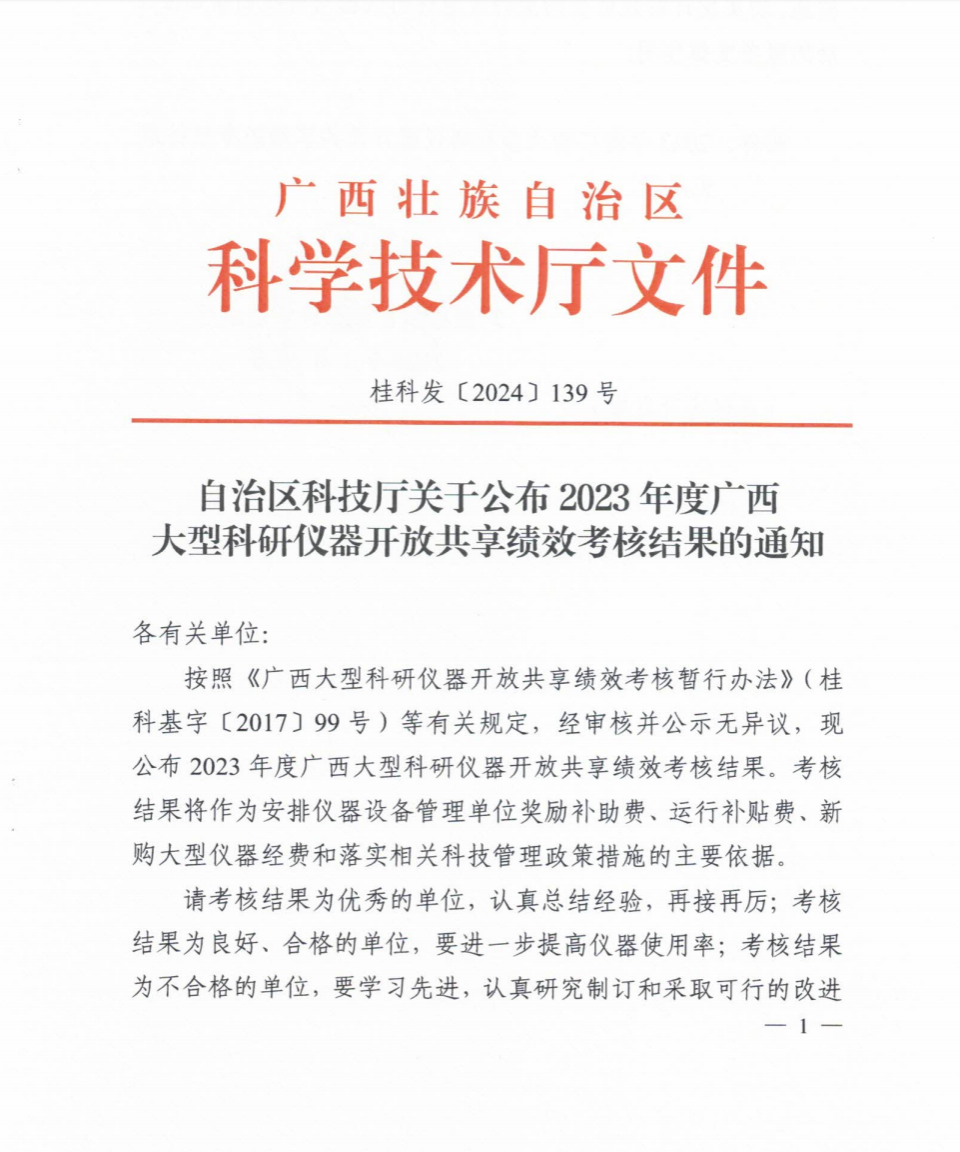 根据自治区科技厅发布的《自治区科技厅关于发布2023年度广西大型科研仪器开放共享绩效考核结果的通知》(桂科基字〔2024〕139号),best365官网考核结果为良好,这是best365官网首次获得良好等次。考核结果将作为上级部门安排仪...