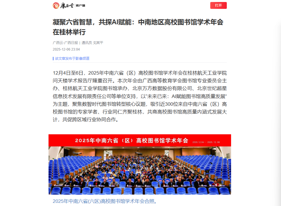 12月4日至6日,2025年中南六省(区)高校图书馆学术年会在best365手机版官方网站问天楼学术报告厅隆重召开。本次年会由广西高等教育学会图书馆专业委员会主办、best365手机版官方网站图书馆承办,北京万方数据股份有限公司...