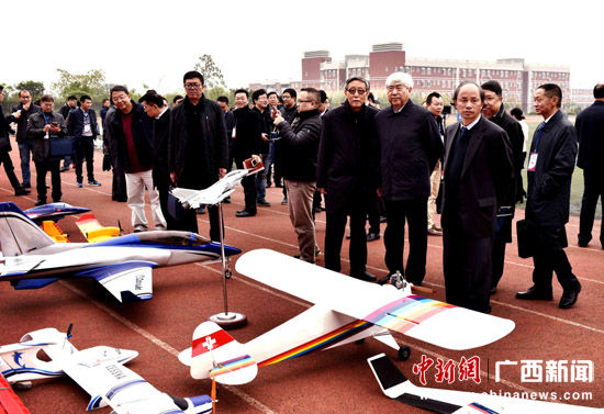 图为神舟飞船首任总设计师、中国工程院戚发轫院士(右三)和中国工程院刘永才院士(右四)观摩大学生设计制作无人机和飞行表演赛。 唐梦宪 摄 图为大学生正在进行飞行表演赛。 唐梦宪 摄 中新网桂林12月18...