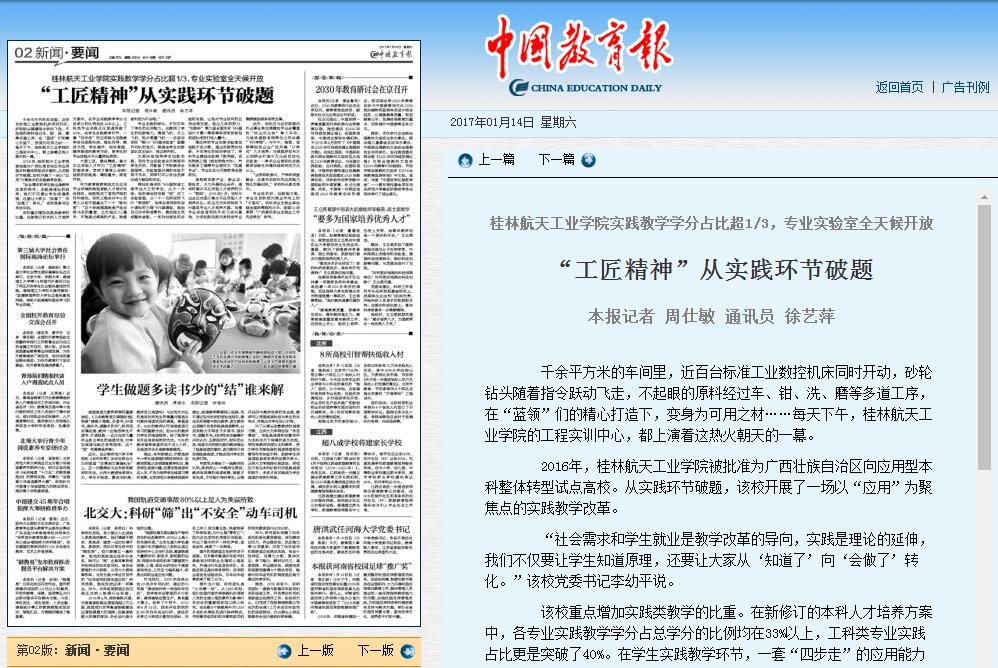 2017-01《中国教育报》要闻版头条:“工匠精神”从实践环节破题