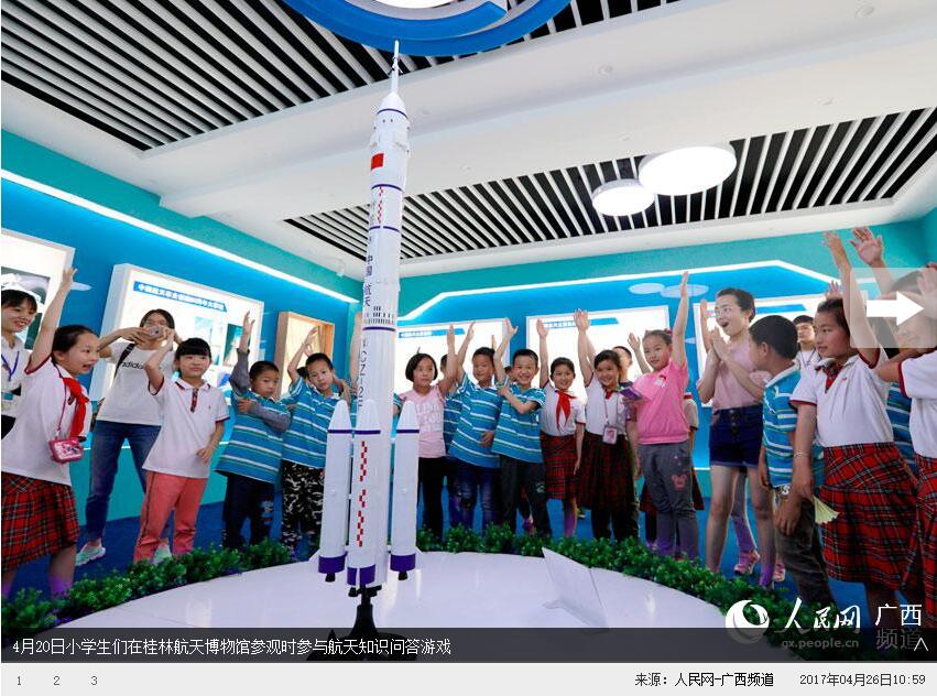 图为小学生们在桂林航天博物馆参观。徐艺萍 摄 中新网广西4月27日电(徐艺萍)“快看,快看,这里有大飞机和火箭!”一走进坐落在best365手机版官方网站的桂林航天博物馆,来自桂林市新建小学的孩子们都兴奋地欢呼起...
