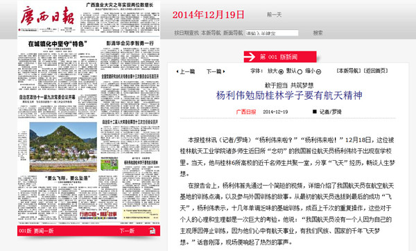 2014-12《广西日报》:杨利伟勉励桂林学子要有航天精神