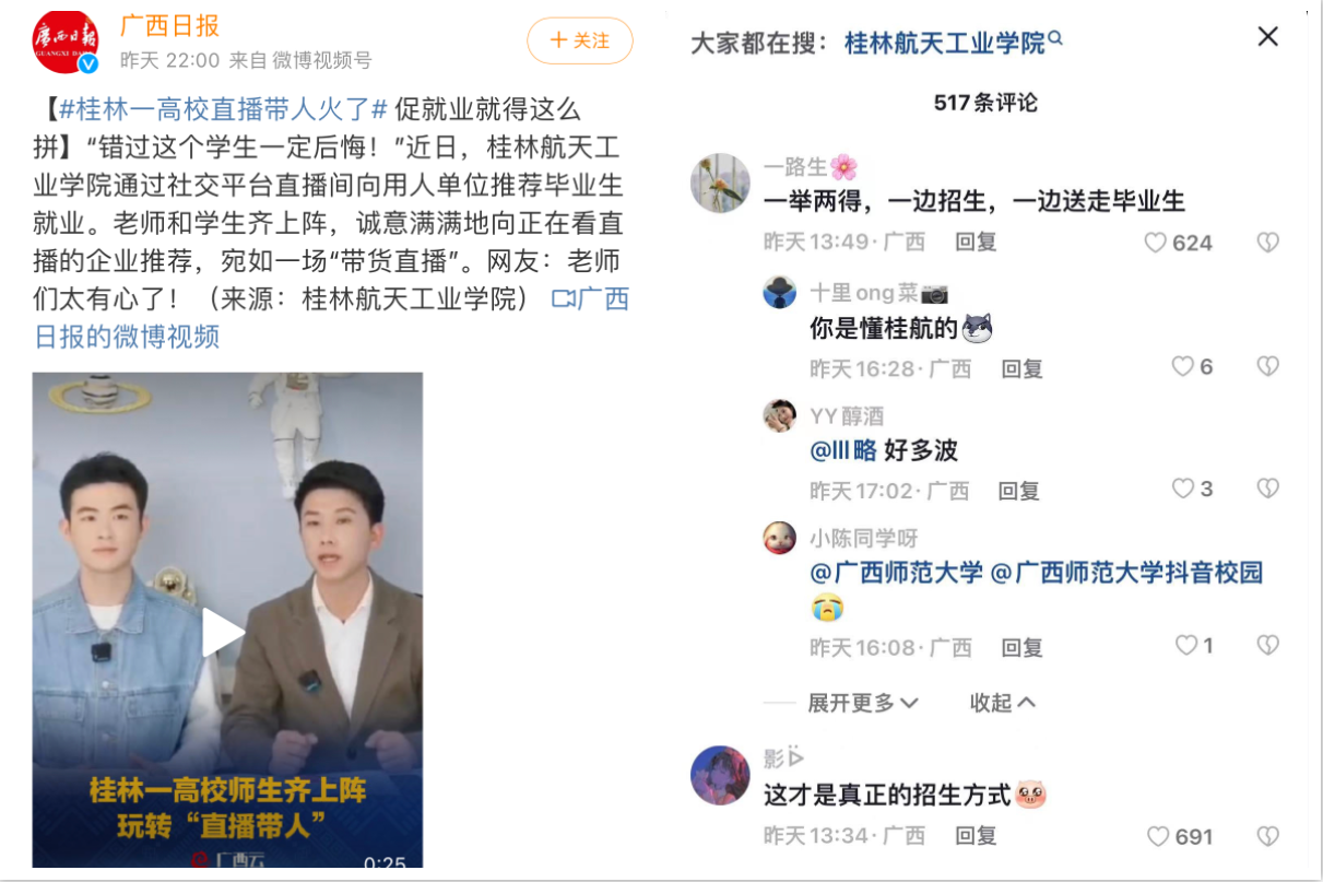 七星区持续开展“新媒体月”系列直播活动走进best365手机版官方网站,开展直播+桂林宝藏打卡地系列活动,走进春日浪漫校园,直播镜头通过通关寻宝,带领网友打卡校园里的航天品质中心、紫荆花道等地,普及航空航天知...
