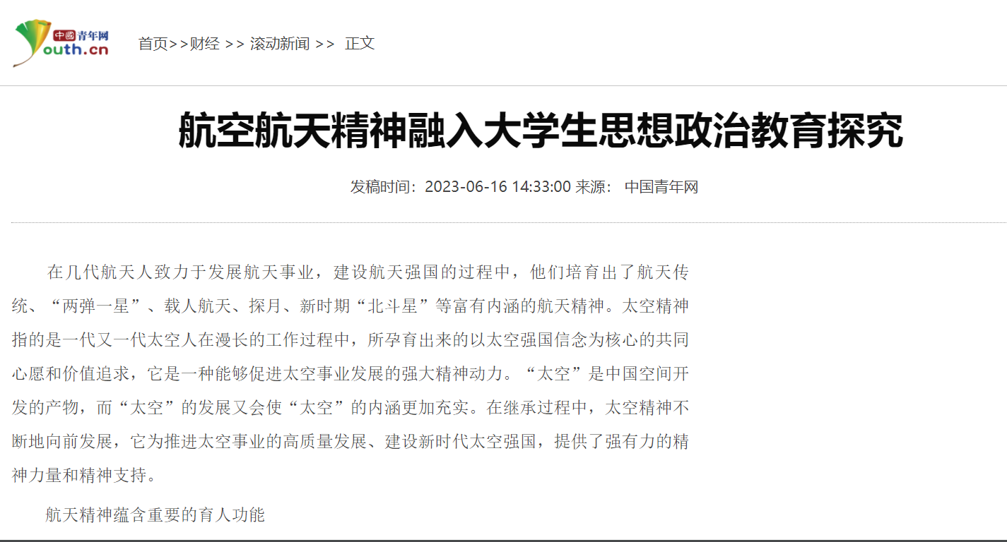 2023-08【中国青年网】航空航天精神融入大学生思想政治教育探究