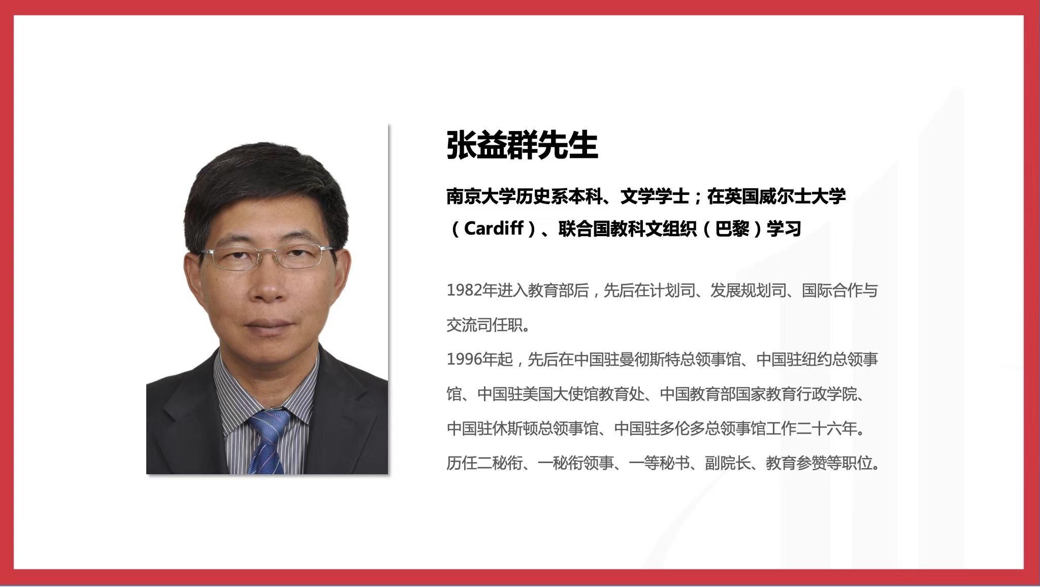 主题:中国对外教育交流与我的外交往事时间:2024年5月8日(星期三)09:20—11:30地点:北校区致远楼108主讲嘉宾:张益群嘉宾简介:1982年进入教育部后,先后在计划司、发展规划司、国际合作与交流司任职。1996...