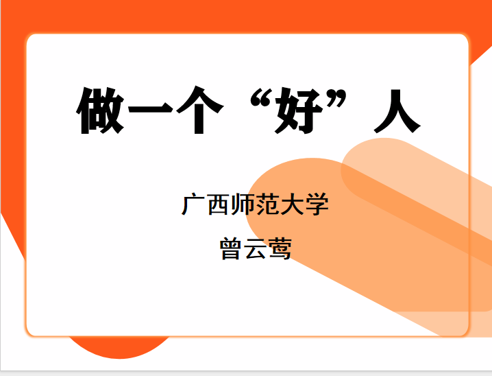 主题:做一个好人——行道德之事,做时代新人时间:2024年6月22日(星期六)15:00——16:30地点:南校区飞天楼402教室主讲嘉宾:曾云莺嘉宾简介:女,法学硕士。从事德育工作。广西师范大学政治与行政学院道...