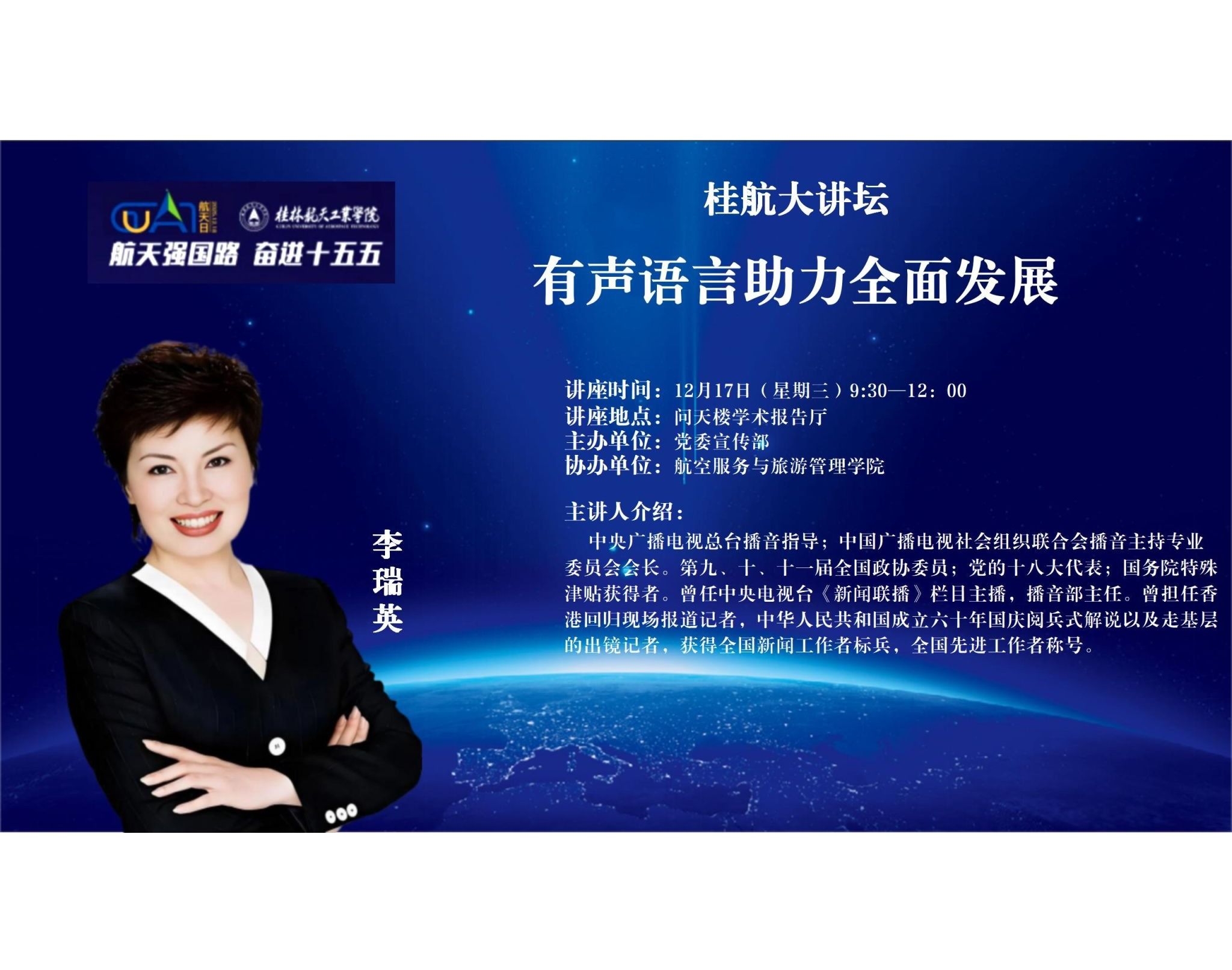 讲座主题:有声语言助力全面发展讲座时间:12月17日9:30——12:00讲座地点:问天楼学术报告厅主办单位:党委宣传部协办单位:航空服务与旅游管理学院主讲人:李瑞英主讲人介绍:中央广播电视总台播音指导;中国...