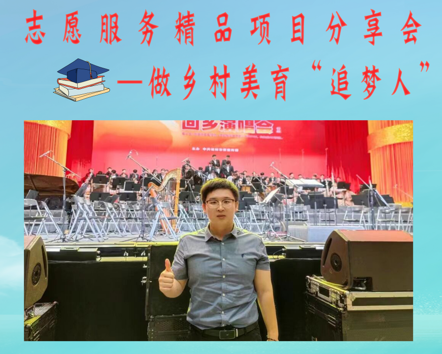 主题:志愿服务精品项目分享会——做乡村美育“追梦人”时间:2023年03月12日(星期日)15:30——17:00地点:北校区致远楼108主讲嘉宾:翟俊豪,中共党员,广西师范大学音乐学院团委副书记、辅导员,中国第十九届...