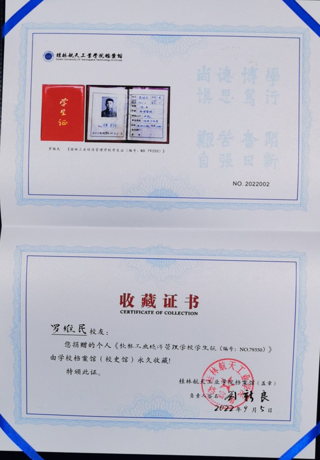 2022-09优秀校友罗维民捐赠个人学生证