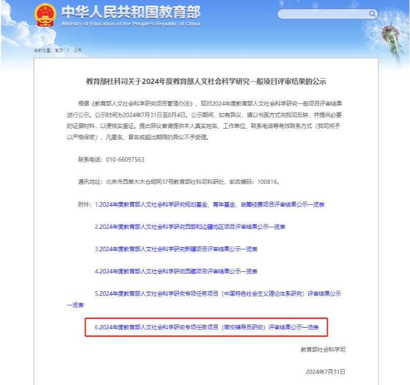 近期,教育部社会科学司对2024年度教育部人文社会科学研究一般项目评审结果进行了公示,电子信息与自动化学院辅导员赵景阳申报的《数智时代大学生网络“轻社交”的成因、影响及引导策略研究》获批高校辅导员研究...
