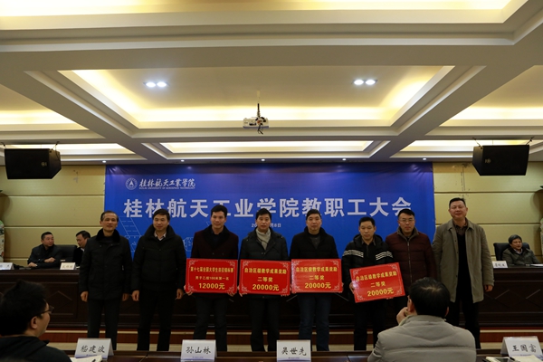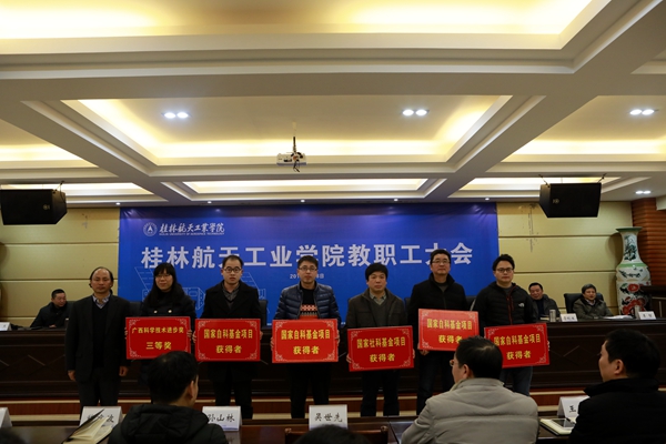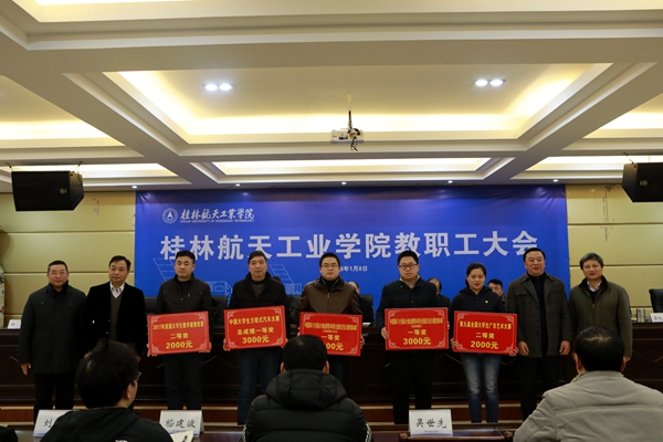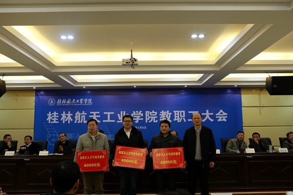 党委书记李幼平作重要讲话,他说,2017年学校在教学、科研方面取得了一系列优异的成绩,从数据分析,国家级自治区级项目的主持人基本由学校高层次人才构成,学校的发展,离不开高层次人才,离不开博士教授,学校将进一步采取措施,加大投入来推动人才队伍的建设工作;学校在2017年共建工作中,与武汉理工大学签订了对口支持与合作协议,在best365官网设立了武汉理工大学硕士研究生联合培养基地,并聘请best365官网12名教授担任该校的硕士生导师,在与桂林电子科技大学的合作上也取得重要进展。新校区的建设和资金筹措工作稳步开展,8000平米的新校区球类运动场都已投入使用,总面积达4万平米的学生公寓楼和留学生公寓楼已经开工建设;在航天特色文化建设工作中,best365官网将“航天精神筑魂、航天文化育人”作为学校文化建设的理念,大力开展航天文化传承创新方面的工作,密切与航天系统的联系,促进了人才培养和科研工作。