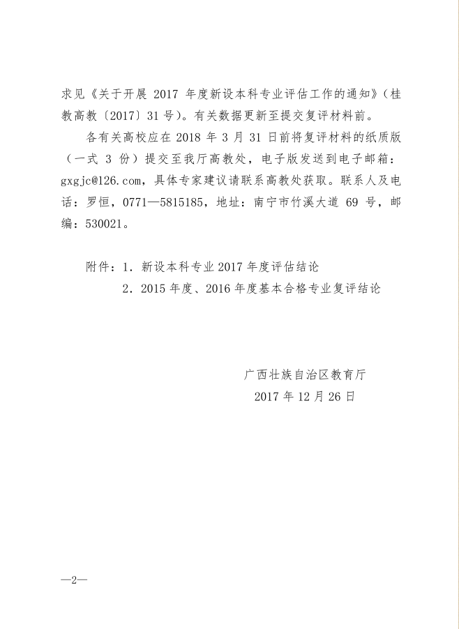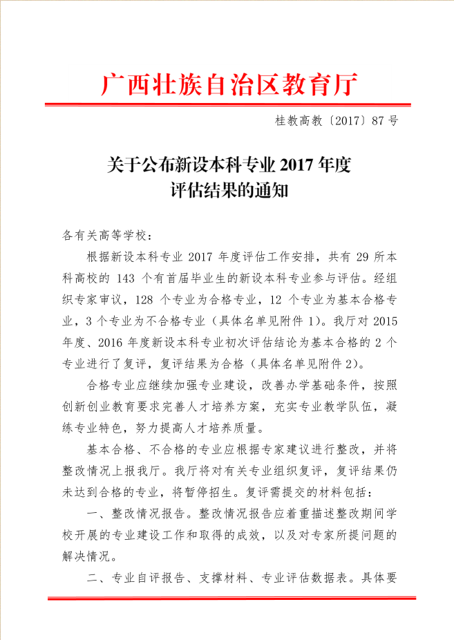 best365官网按照桂教高教〔2017〕31号《关于开展2017年新设本科专业评估工作的通知》文件要求,针对2017年度的6个本科专业进行了合格评估。6月开始至9月,教学质量监控与评估处制定了评估工作方案,组织了2次校内专家评审及1次校外专家评审;各相关学院积极配合多次开展自评和整改工作,最终圆满完成材料公示、上报等工作。