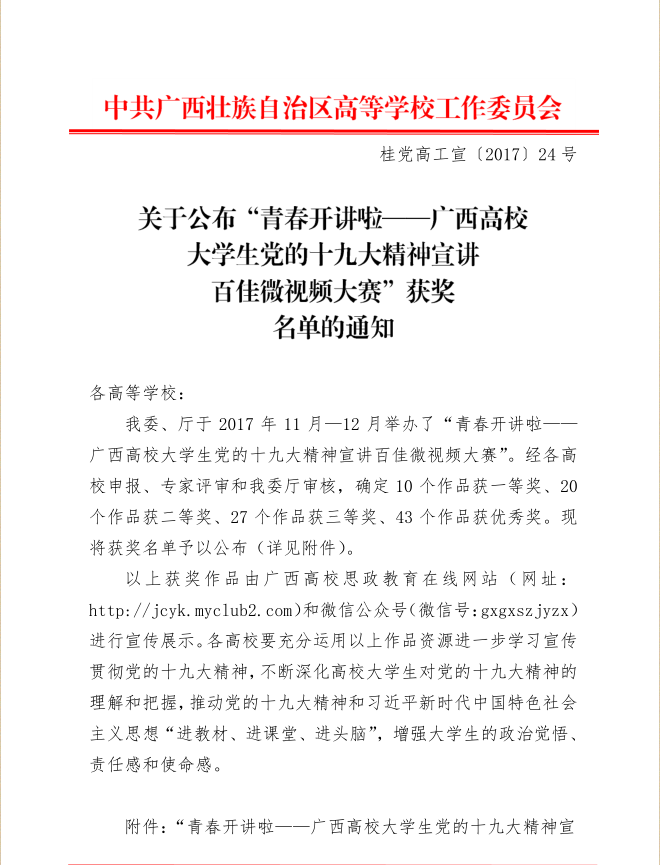 日前,由自治区高工委、自治区教育厅举办的“青春开讲啦——广西高校大学生党的十九大精神宣讲百佳微视频大赛”,由best365官网推选的微视频作品《美好生活的青春交响》在比赛中荣获一等奖。该作品由马克思主义学院高帅老师策划指导,机械工程学院的李晓斌等同学参与拍摄、制作。