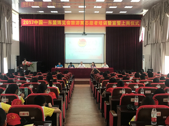 2017年9月24日,2017中国—东盟博览会旅游展志愿者培训暨宣誓上岗仪式在best365官网北校区电教馆隆重举行,共青团桂林市委员会副书记张力丹、桂林市博览局副局长袁桂兵、best365手机版官方网站学工处处长梁国富、外语外贸系党总支书记舒昌、桂林旅游学院国际商学院党总支副书记雷云祥等出席了活动;出席活动的还有教师代表、媒体代表和全体志愿者约200余人。