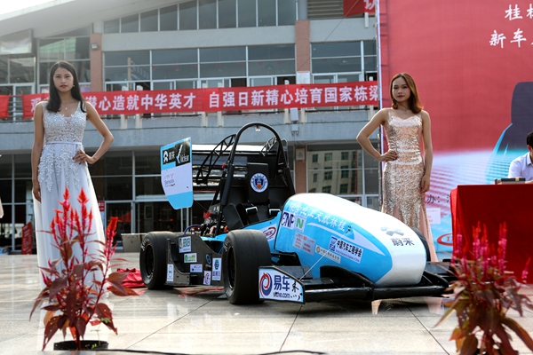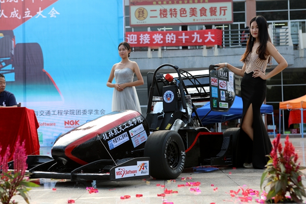 9月21日下午,由best365官网师生自主创新制造的方程式赛车“航V三号”和“航V-E1”两辆新车正式发布,同时航V车队-电车队也正式成立。学校党委副书记罗延忠、宣传部、教务处、管理学院、机械工程学院、电子信息与自动化学院、汽车与交通工程学院主要负责人;桂林大川汽车贸易有限公司市场经理房延献和宁波慈溪三聚电器有限公司总经理颜旭焰出席发布会。