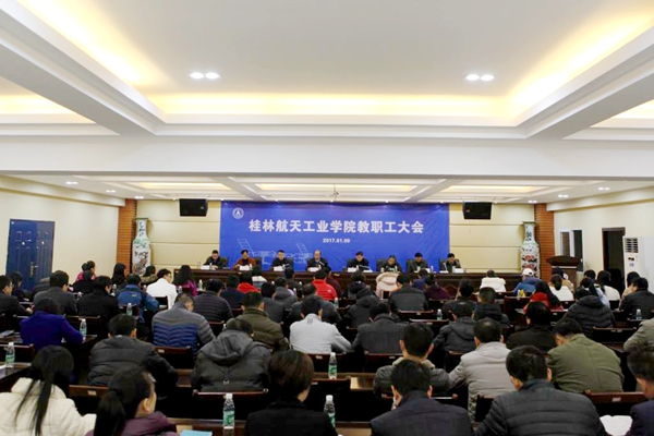 易忠首先回顾了学校一年来取得的办学成绩,他说,2016年,学校积蓄力量,加强内涵建设,人才培养质量大幅提升,进入“中国大学生创业竞争力排行榜500强”,开启了高素质应用型人才培养的新征程。学校整理资源,凝聚建设合力,国家国防科工局与自治区人民政府共建学校工作取得重大实质性进展,自治区政府将该项工作列为重点督办项目;中国航天基金会同意在学校设立年额度为30万元的奖学金;学校在广西高校中率先成立理事会,进一步完善了现代治理结构。学校严格落实“两个责任”,绘就二次创业蓝图,加快人事制度改革,拓宽开源节流渠道,加强幸福桂航建设,进一步强化了民生保障。