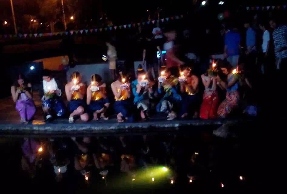 表演结束之后,便是本次晚会的压轴节目——放水灯。留学生花费近半个月的时间,用芭蕉杆、芭蕉叶、鲜花、彩纸、蜡烛等材料制作了近三百盏水灯。她们手工精巧,做出的水灯精致、花样众多。中外师生们手捧一盏盏精美的水灯,虔诚许愿,把水灯放到水中。顿时,小池塘变成了烛光天堂,流光溢彩。美丽的水灯承载着大家心中的思念与祝福,遥寄远方的亲人和朋友的祝福。同时,到场的观众都能免费品尝到由留学生们亲手制作的泰国西米露、果汁等传统小吃。