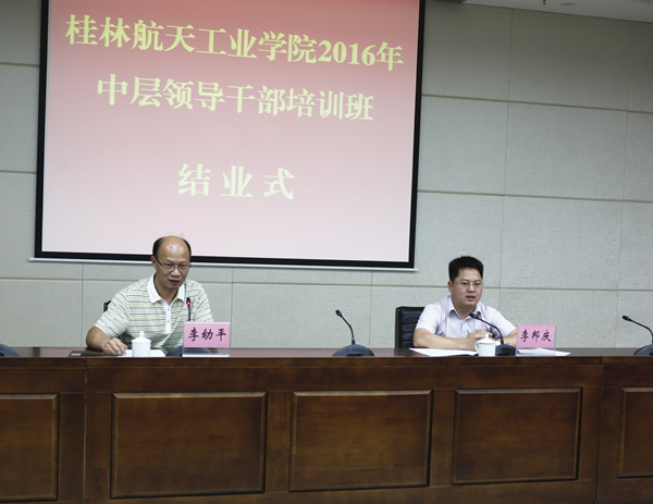 党委书记李幼平在培训班结业仪式上作了重要讲话,对广西干部学院在教学管理、学习条件和生活保障等方面为培训班所做的工作表示感谢,他指出,此次在广西干部学院的集中培训是今年学校中层干部培训的重要环节,此次培训邀请专家层次高,专题辅导报告安排合理,全体学员认真学习,严格遵守广西干部学院的有关规定和培训班的工作纪律要求,取得了预期的效果。他强调,培训结束后,校级领导班子成员和全体中层干部要及时、认真组织开展专题讨论,统一思想,凝聚共识,切实找准学校发展的定位和目标,为学校二次创业奠定好基础、积蓄好力量。