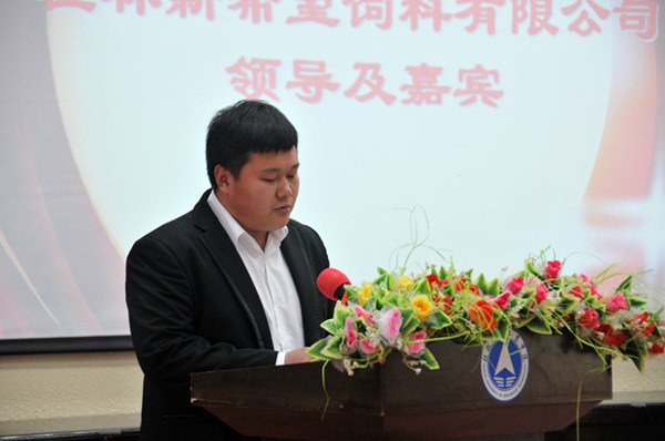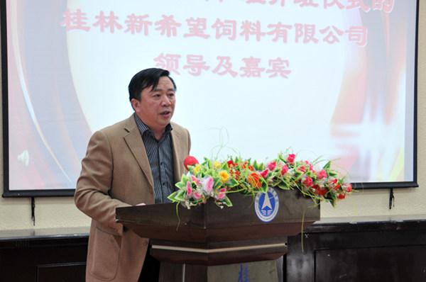 蒋祖斌总经理在致辞中也充分肯定了此次合作的意义,他通过一个视频,系统的介绍了新希望集团的发展大事纪和企业文化,他表示,桂林新希望饲料有限公司将尽可能的为大学生提供更多的实习、实训、就业及创业平台,尽可能的为老师们提供良好的实践教学环境,校企双方共同把这次合作做实、做强、做大,实现学员、学校、企业三方共赢。