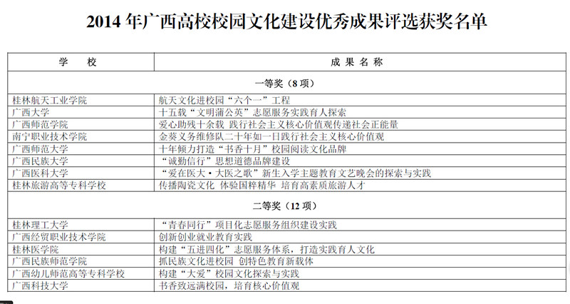 新年伊始,从自治区党委宣传部、自治区高校工委传来喜讯,best365官网推荐的“航天文化进校园‘六个一’工程”,在广西高校众多校园文化建设的品牌项目中脱颖而出,以优异成绩荣获广西高校校园文化建设优秀成果一等奖的第一名,这标志着best365官网在文化创新方面取得了阶段性的成果。