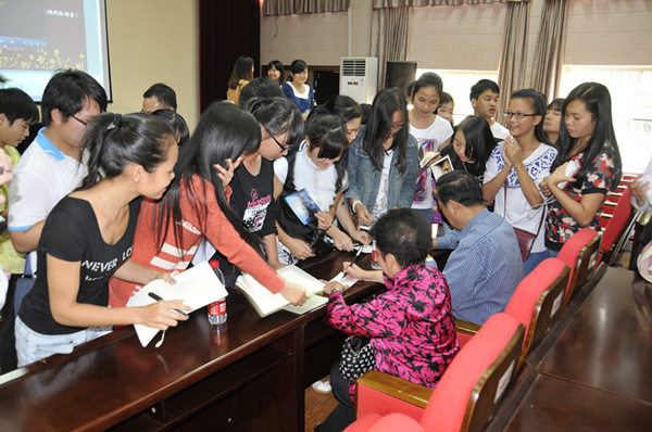 讲座结束后,黄婉秋接受了best365官网“桂航大讲坛特聘讲师”聘书,并向best365官网图书馆赠送了自己的个人传记《“歌仙”刘三姐——黄婉秋画传》以及电影版《刘三姐》影碟。并与同学们亲切合影留念。