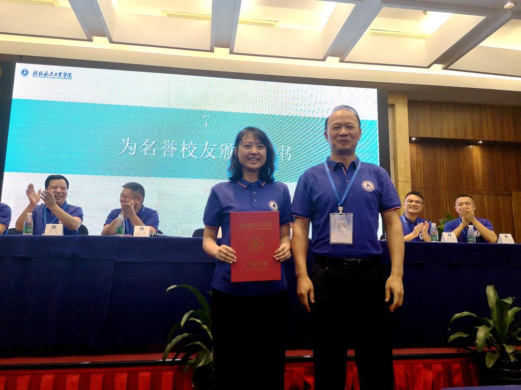 李幼平代表学校高度赞赏桂航校友在社会各界的发展成就,对不辞辛劳从祖国四面八方奔赴深圳年会的各位校友代表及已毕业的7万余名桂航校友表示衷心的感谢,对慷慨解囊、精心组织、用心服务的深圳站站长、深圳华波美集团科技公司董事长王丹校友及其公司团队成员、深圳站全体校友表示诚挚的谢意。他深情回顾与校友们在一起的美好时光,指出,是桂航校友的奋斗与支持,帮助学校实现了办学格局的大提升;是桂航校友的奉献与真情,帮助学校开拓了校友工作的新局面。他强调,今后学校将以校友的需求作为校友工作的出发点,从五个方面发力:一是搭设好大舞台,积极申请成立校友总会;二是运用好“校友之家”微信公众号平台,建设精神家园;三是建立终身服务校友的体系,建立起共享学校资源的机制;四是探索成立校友企业家联谊会,聚合校友资源,实现共商共建共享;五是宣传和表彰一批贡献突出的杰出校友,树立标杆和榜样。他与校友共同展望学校远景,强调学校将坚持以目标为引领,全面、纵深推进“1333”发展方略。他代表学校诚挚邀请校友出席母校40华诞庆典,吹响了桂航人“相聚母校、共庆四秩”的集结号。会上,李幼平还为长期关心和支持学校发展的王丹校友的企业职工-深圳华波美科技集团有限公司办公室主任赵颖奇同志颁发了“名誉校友”聘书。