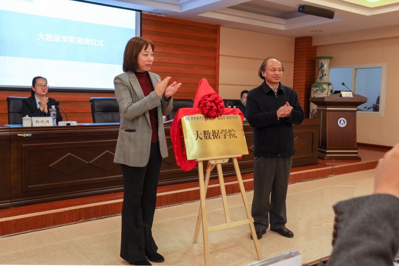 会上校长易忠与青软科技CEO郭晓丹共同为大数据学院揭牌。