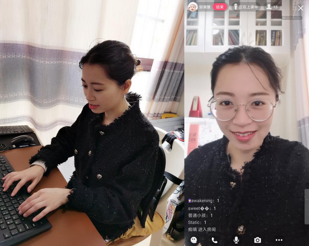 航空旅游学院播音主持专业许丽君老师采用网络直播课的形式为学生讲课,她说,我们这门课程没有特别适合的慕课资源,录课程视频又没互动,所以才大胆尝试直播课。我第一次课是用慕课+录课,学生反映效果不是很理想,所以昨晚上赶紧研究直播模式,第一次当“主播”有点紧张,不过学生还挺喜欢。个别学生网络会有点卡顿,但整体进行得还挺顺利的。