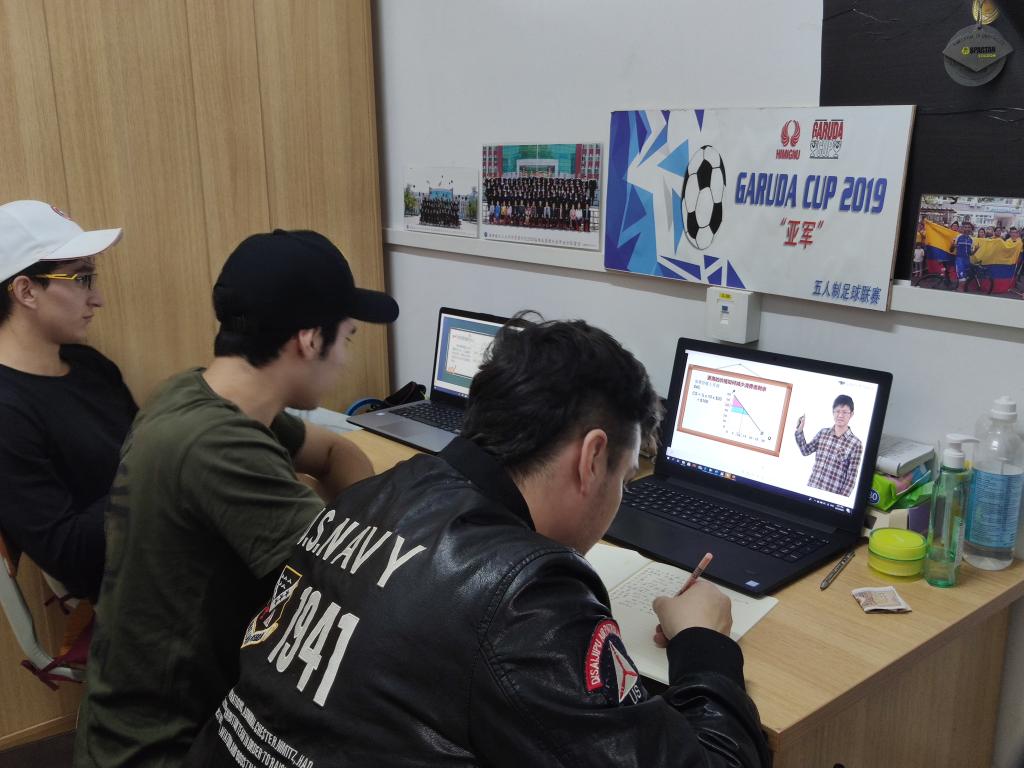 ——来自哥伦比亚的朱安(2016物流管理专业)、米格尔(国际商务专业)、卡斯特罗(2018级国际商务)一起在宿舍学习网络课程。