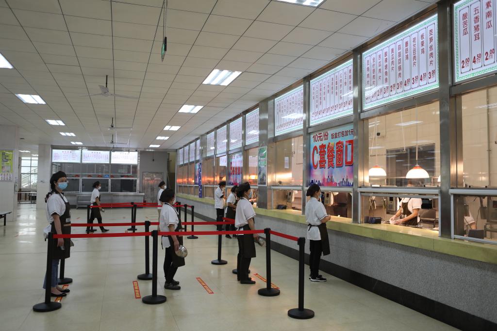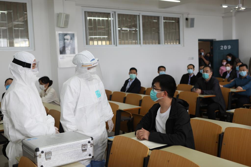 本次演练由学校疫情防控一线工作人员进行场景模拟演练,围绕学生返校的重点环节,共设开学校大门接待、开学学生发热处置、入住隔离医学观察区、教师课堂教学过程中学生发热处置、食堂分餐就餐五个场景,对学生入校、学生宿舍健康监测、公共场所教学和疑似病例应急处置等进行了重点演练,从排队引导、测温亮码、身份核验、扫码报到、校内接驳各环节,到宿舍、教室、学校隔离观察区各领域进行全方位演练。所有参演人员按照既定预案,迅速行动,分工明确,准确高效地完成了突发新冠肺炎应急处置演练任务。