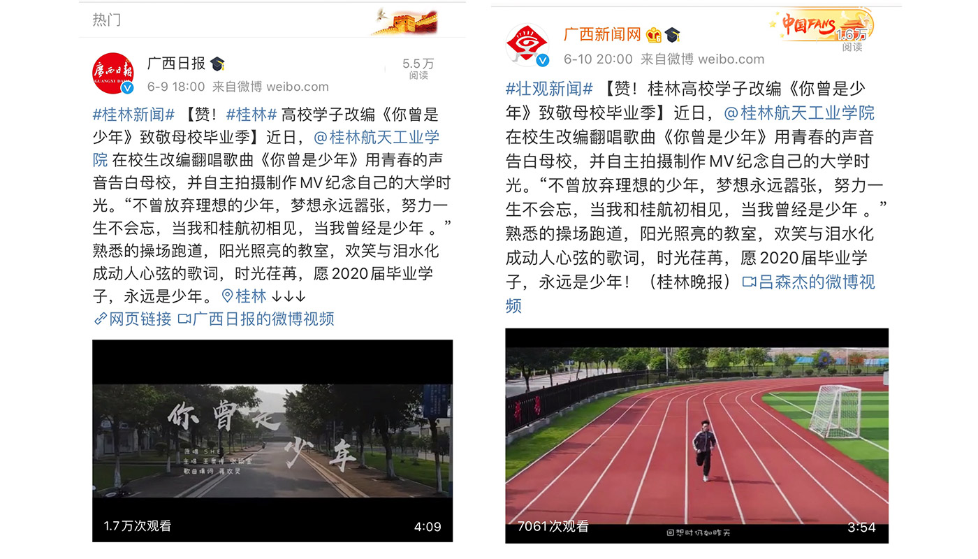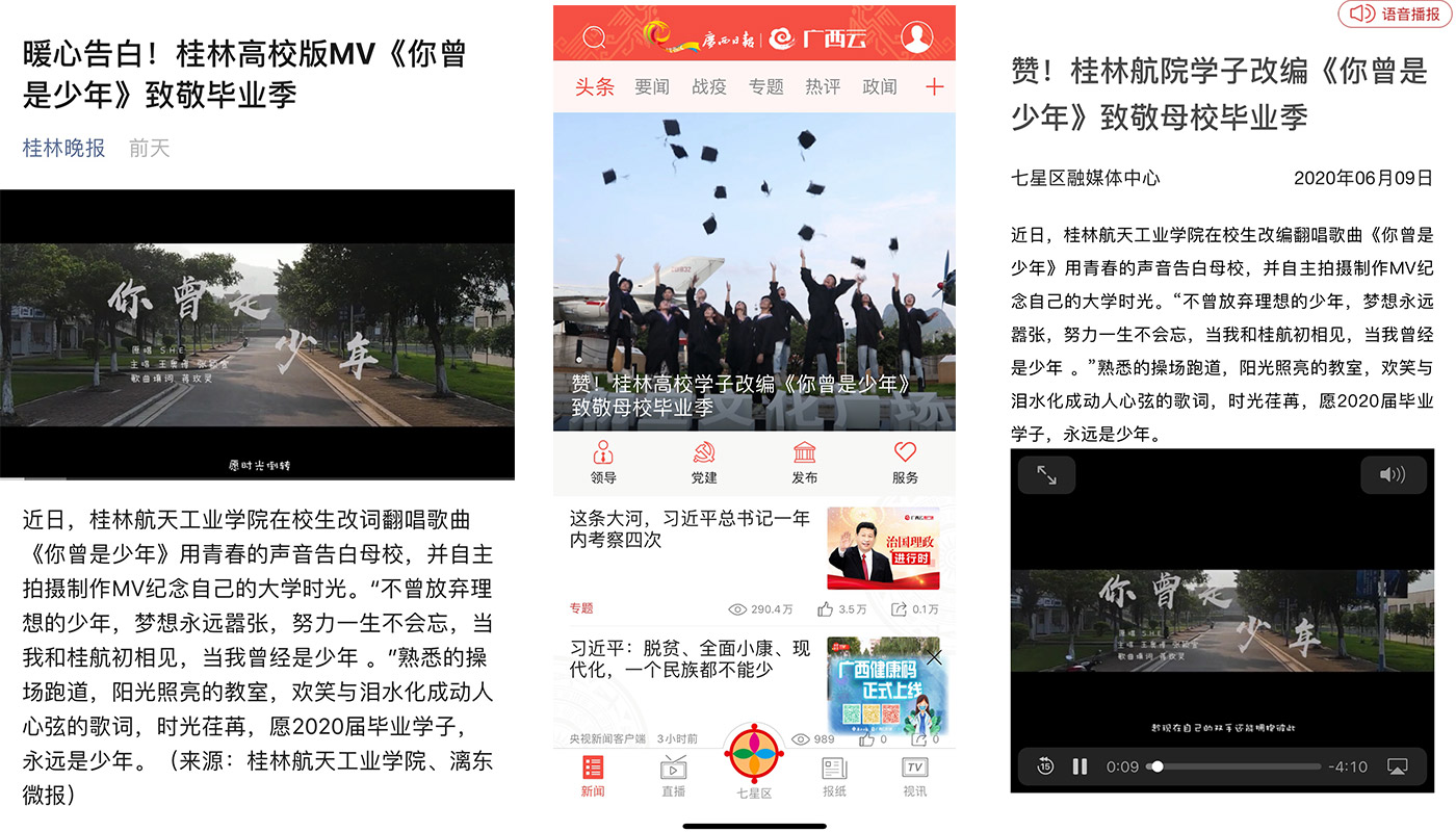 近日,best365官网在校学子改编翻唱《你曾是少年》用青春的声音告白母校,并自主拍摄制作毕业季MV纪念自己的大学时光。人民网、学习强国、广西日报、广西新闻网、桂林晚报、桂林生活网等多家媒体报道和转载了该原创视频。据统计,视频发布3天以来,各平台累积播放量已超20万。