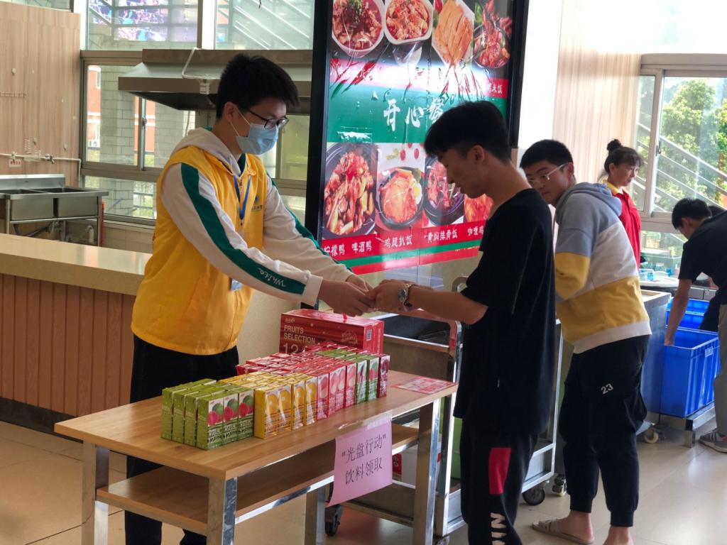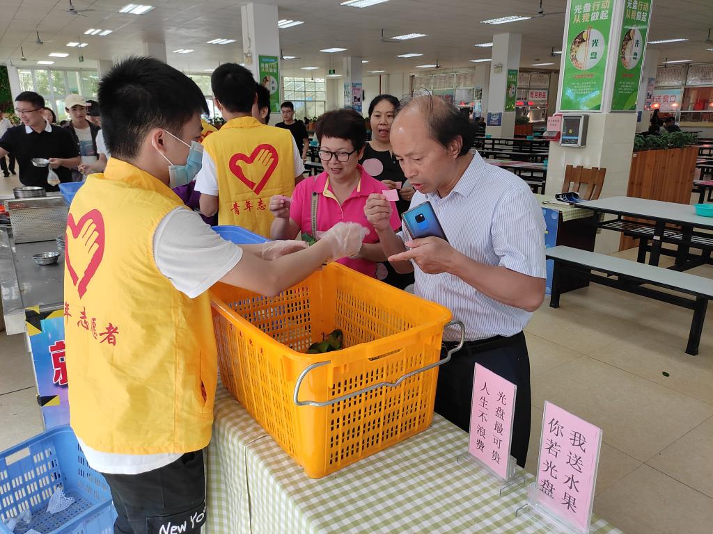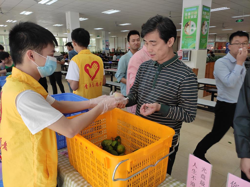 为鼓励师生人人光盘,best365官网师生用餐结束后,只要将“光盘”放至餐盘回收处,即可到指定窗口领取餐后水果一份。期间,校长易忠特意来到活动现场,鼓励师生牢固树立勤俭节约意识、践行勤俭节约。