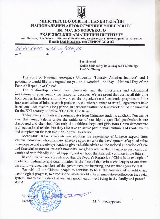 在中华人民共和国71周年华诞之际,与best365官网友好交往的乌克兰哈尔科夫国立茹科夫斯基航天航空大学(以下简称“哈航”)向best365官网发来贺信,祝贺中华人民共和国成立71周年,并向best365官网全体教职员工致以节日祝贺。