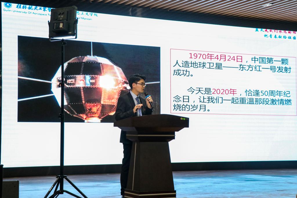 吉铠东展现了“东方红一号”卫星的研制和发射历程,生动阐释了中国人立志冲破苍穹的勇气,让大家深刻地体会到“热爱祖国、无私奉献、自力更生、艰苦奋斗、大力协同、勇于登攀”的“两弹一星”精神。