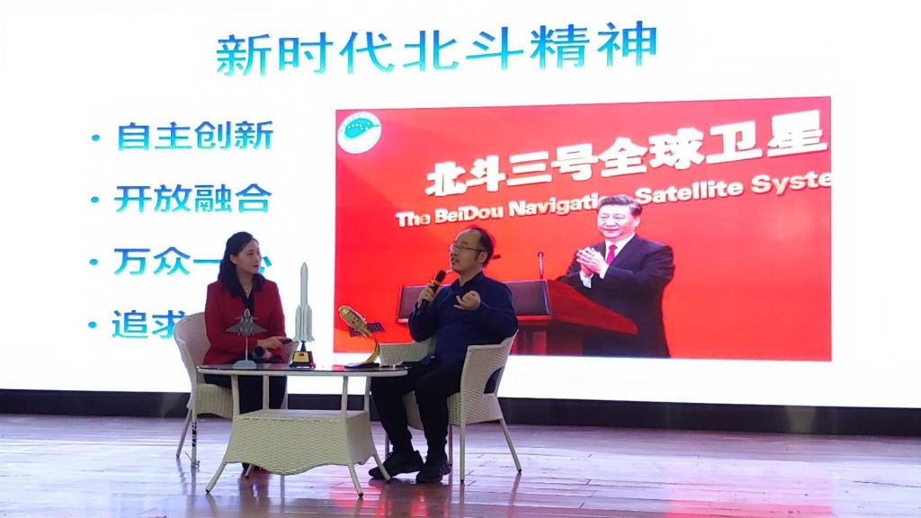徐艺萍分享了北斗全球卫星导航系统组建的历程,大家通过视频回顾北斗卫星历次发射成功激动人心的瞬间,之后,以现场访谈的形式,和best365官网电子信息与自动化学院许晓勇博士展开对话,来自北斗系统科研前沿的真实事例,让大家更为深刻地理解了“自主创新、开放融合、万众一心、追求卓越”的新时代北斗精神。