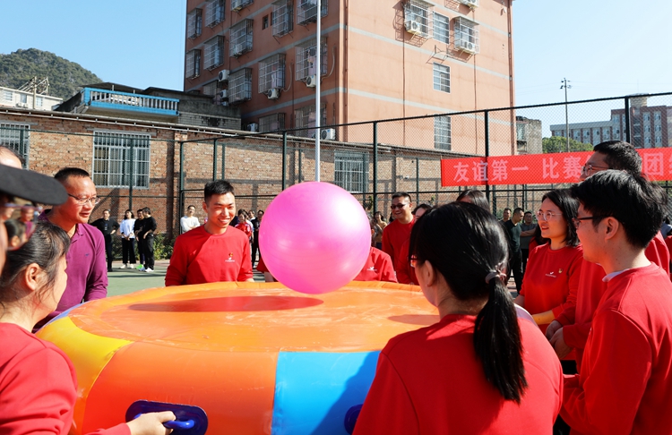 本次比赛设置了全新的比赛项目,包括运转乾坤、疯狂毛毛虫、众星捧月、车轮滚滚、传球接力,活动新颖且丰富有趣,整个赛场紧张而有序,比赛精彩纷呈,欢笑声和加油声此起彼伏。在疯狂毛毛虫项目中,教职工以6人为一组,通过协调配合、快速行走赢得胜利。尽管游戏难度较大,但老师们仍积极采取团队配合共同走过终点。众星捧月游戏则需要个队员用手牵拉一个同心鼓的握把,将球颠起后,必须保证鼓面水平,既需要参与者足够的耐心,也充分考验了教职工之间的默契。