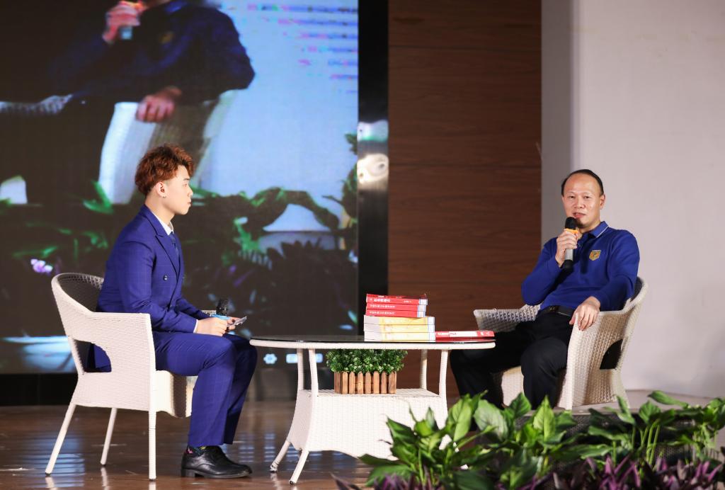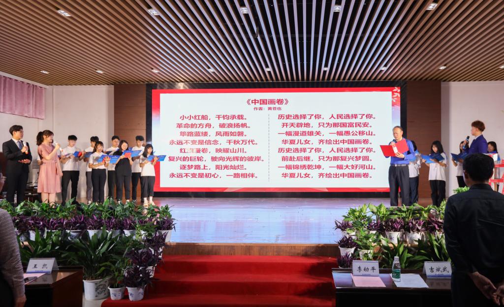 李幼平为广大青年学子推荐了红色书籍《红色的起点》和《解放战争》,鼓励学生阅读党史书籍,提高历史的自觉性,树立全面、辩证和深刻的历史观。他指出大学生要不忘历史,学习历史,不断地从历史的经验教训中汲取营养实现新时代青年人的责任与担当。随后,他带领全场师生诵读了黄苍也的《中国画卷》。