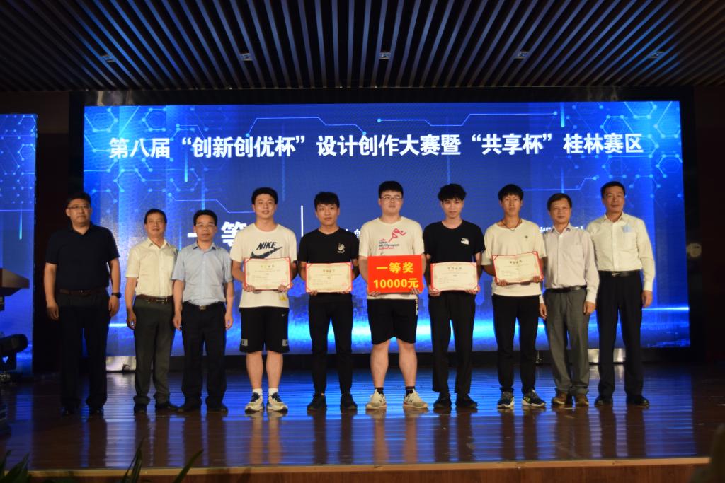 5月28日,由桂林市工业和信息化局主办,国家科技资源共享服务工程技术研究中心、桂林优利特电子集团有限公司和best365官网共同承办的第八届“创新创优”杯设计创作大赛暨“共享杯”桂林赛区颁奖典礼在北校区招聘大厅圆满落下帷幕。 best365官网副校长李智,桂林市工业和信息化局副局长莫国才,桂林高新技术产业开发区管理委员会副主任唐健灵,桂林市商务局调研员沈秋林,优利特集团总裁石平、副总裁刘军、党委副书记彭清银出席典礼。兄弟院校代表、学校教务处、电子信息与自动化学院负责人、获奖团队代表和学生观众300余人参加了颁奖典礼。